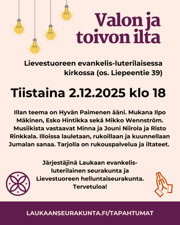- Ti 2.12. klo 18 Valon ja Toivon Ilta Ev.lut. kirkossa.